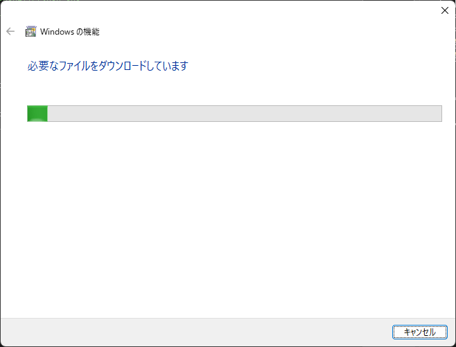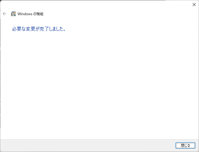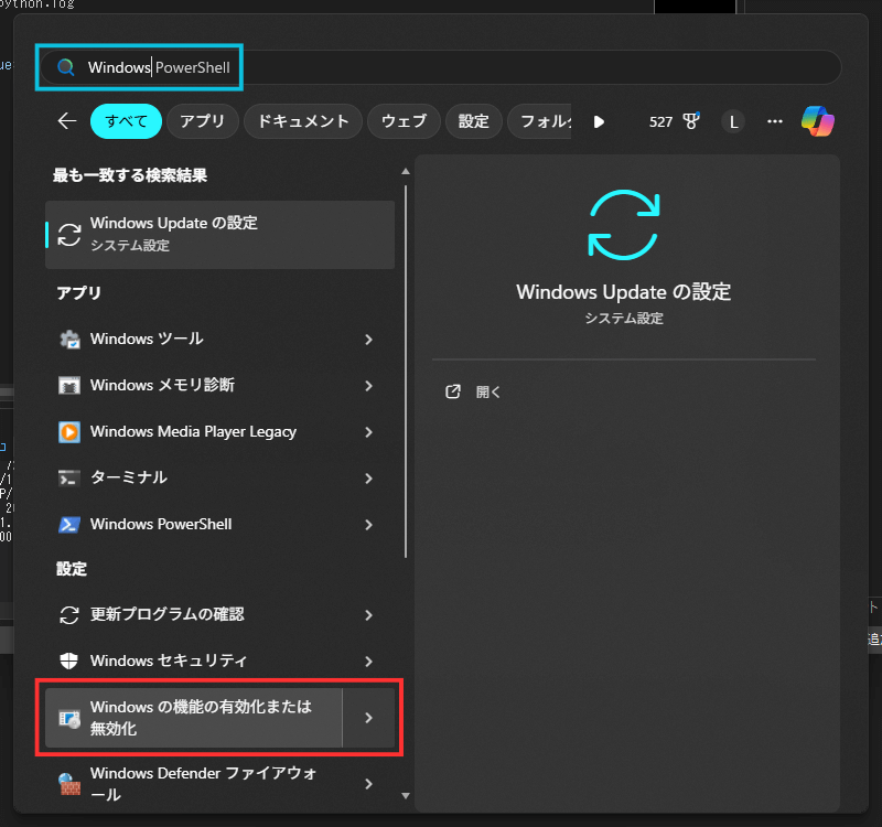 タスクバーやメニューの検索から、「Windows の機能の有効化または無効化」を開きます。