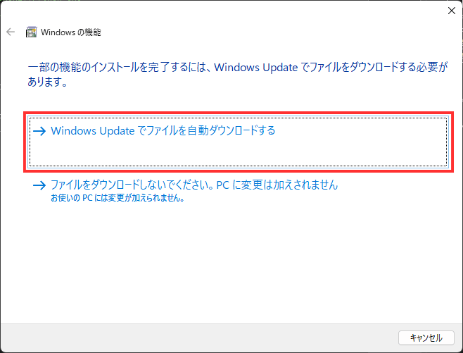 ファイルのダウンロード可否を問われますので、「Windows Update でファイルを自動ダウンロードする」を選択します。