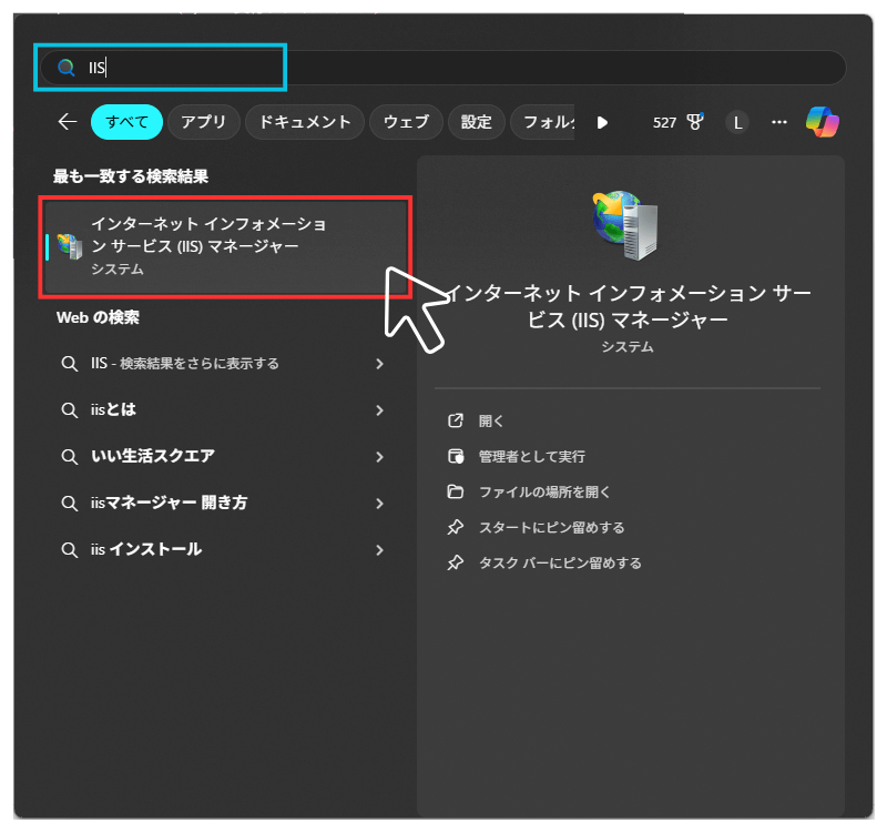 検索から「インターネットインフォメーションサービス(IIS)マネージャー」を探して起動します。