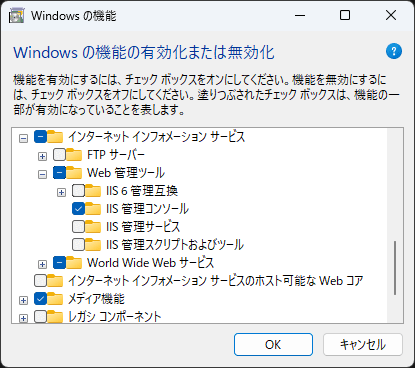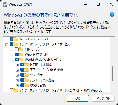 有効化だけであれば「インターネットインフォメーションサービス」のチェックだけで事足りますが、実際には下記の項目辺りが必要になってくることがほとんどです。